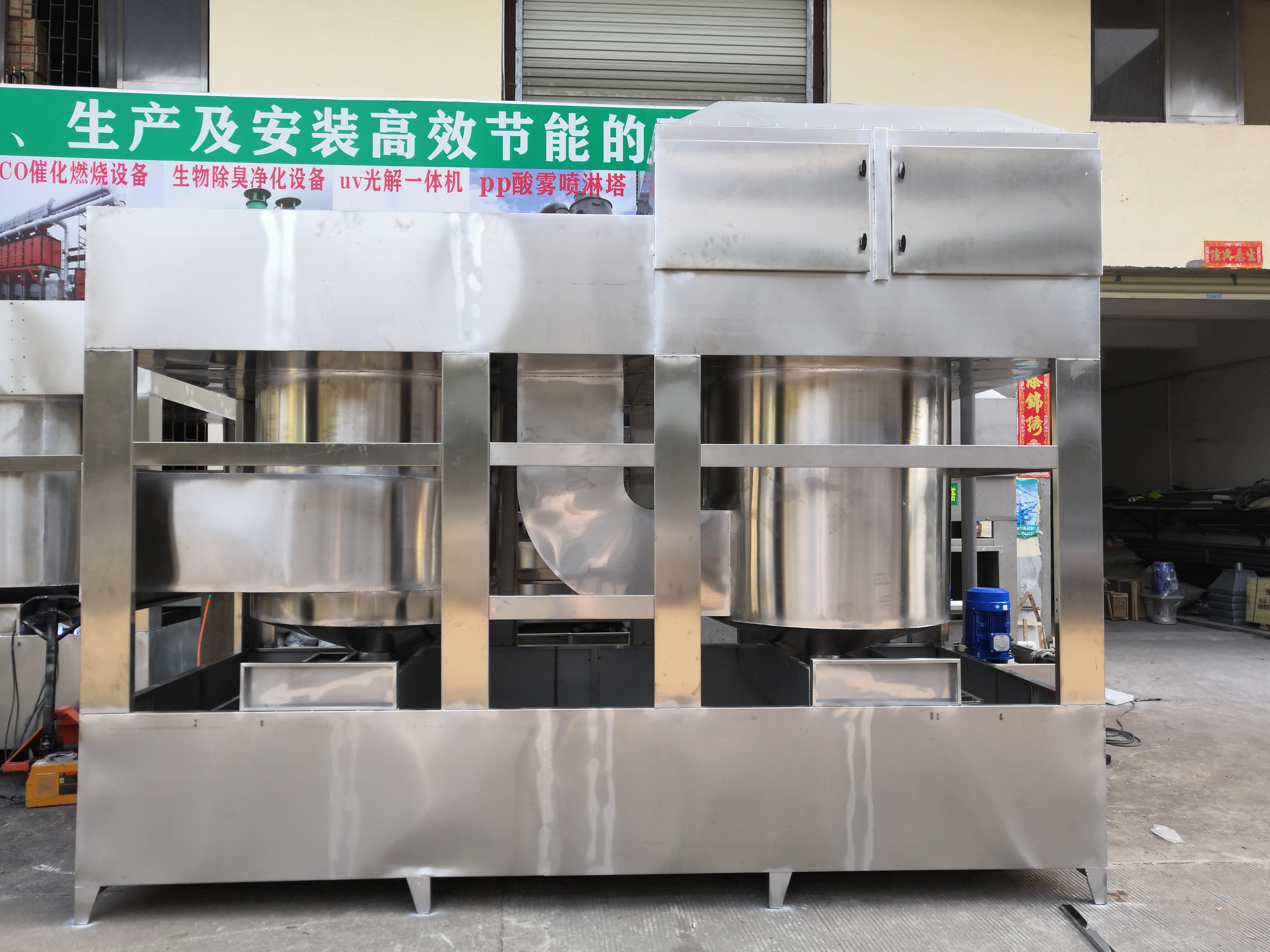 含塵含味氣體通過吸氣罩收集,在風機的作用下,經過管道輸送負壓進入雙級氣旋噴淋塔。氣旋混流裝置快速運轉,多級連續(xù)的凈化使得含塵含味氣體與水霧充份混合,在離心的作用下達到氣液分離。氣旋桶內部采用水泵循環(huán)給水,水在水箱經水泵增壓后自螺旋噴嘴霧化而出,最后回流至水箱循環(huán)使用。分離出來的雜物下沉到水箱底部,經凈化后的氣體進入填料隔水層,然后由風機排出。