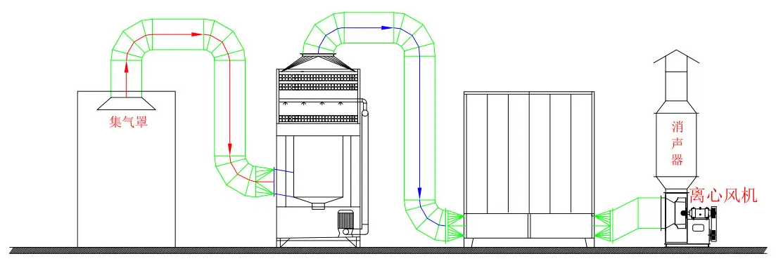 當(dāng)生產(chǎn)作業(yè)時(shí),煙塵廢氣在風(fēng)機(jī)牽引力的作用下進(jìn)入高速混流導(dǎo)軌裝置,煙塵廢氣在離心力的作用下進(jìn)行氣液乳化反應(yīng),在混流液的高速旋轉(zhuǎn)狀態(tài)下,污染物與旋轉(zhuǎn)液體充分混合吸收相溶增加煙塵比重,利用旋流裝置設(shè)計(jì)好的離心力達(dá)到氣液分離,分離后的氣體進(jìn)入環(huán)保填料吸附層,螺旋噴頭噴出的對(duì)應(yīng)溶劑均勻分布在填料上,由于填料的合理設(shè)計(jì),污染物浸透在填料的時(shí)間較長(zhǎng),與反應(yīng)液在專(zhuān)用環(huán)保填料表面有充分的氣液相溶反應(yīng)時(shí)間,從而達(dá)到達(dá)標(biāo)排放的目的。
