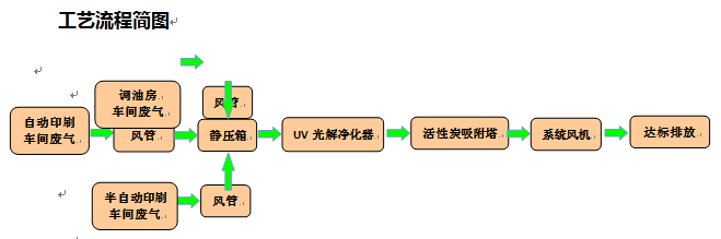 因為該企業印刷機車間均為密閉車間,且已做排風系統,但排風系統和小風機均為直排到高空和廠房1樓外部,影響到了周圍環境。經過我司工程師現場勘查,結合企業的實際生產情況,我們最終決定采用UV光解法+活性炭吸附法來進行處理。